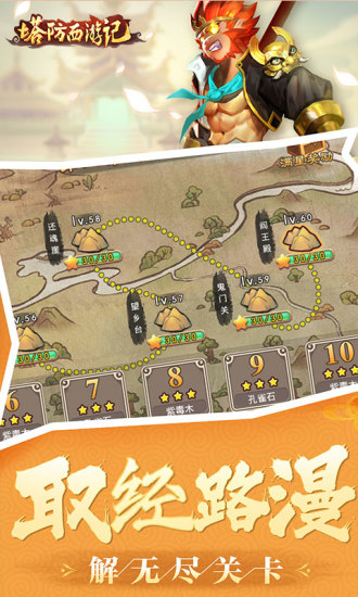 《塔防西游记》是以塔防为核心玩法,复合策略养成玩法的手游。炮塔设计Q萌可爱,动漫风地图设计完美呈现西游取经剧情,轻松益智,三百多张设计精美的剧情地图让人欲罢不能。在这款2D卡通策略塔防游戏中,你将作为西天取经的主人公,组建自己的队伍,招募那些传说中的天兵仙将前往西方极乐世界。天师、弓手等多种职业和仙将们的特色技能,需要你根据不同对战环境来即时调整自己的闯关队伍,指挥他们一路降妖除魔。游戏越到后面,关卡也会越来越有挑战性,我们可以通过秘境寻宝,挑战伏魔塔等游戏特色副本获取装备和升级材料,来打造最强的取经队伍!这个世界需要英雄,快来加入我们,去打败阻拦我们的妖魔鬼怪吧。