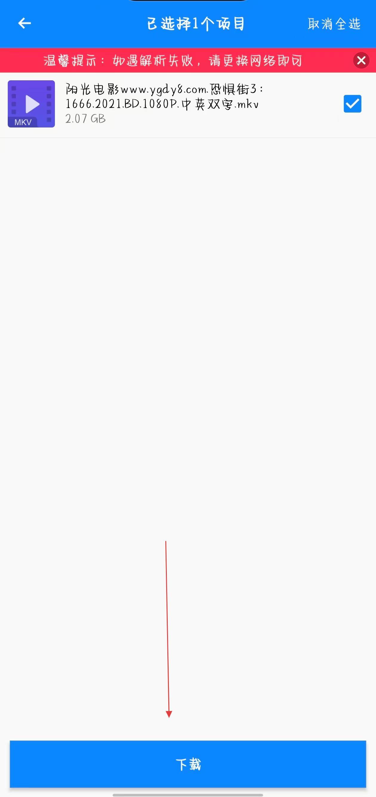3、链接解析完成后,会展示出可下载的文件列表,找到目标文件后,点击文件右上角的下载按钮。