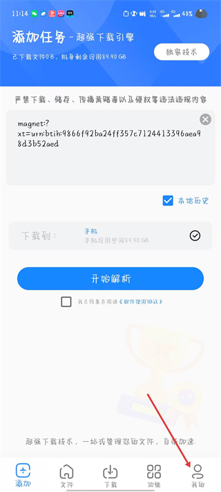 1、打开该下载工具的添加任务页面,点击导航栏的我的选项,进入个人中心界面。