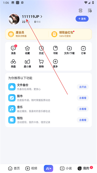 1、打开百度APP,进入个人页面后点击头像旁边的昵称区域。