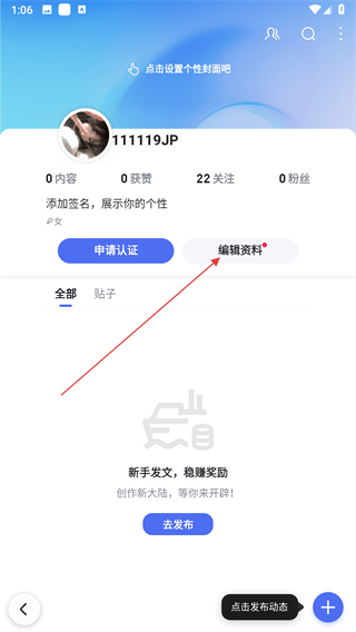 2、在个人主页点击编辑资料按钮,进入编辑个人资料页面。