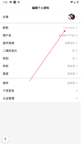 3、在编辑个人资料页面点击昵称选项,进入设置昵称页面。