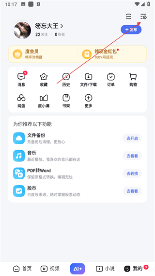1、打开百度应用,点击右上角的功能菜单按钮。