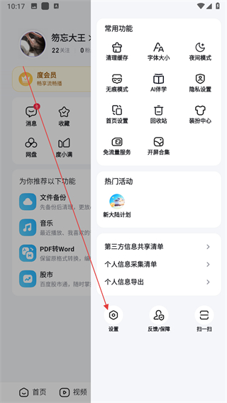 1、打开手机上的百度APP,依次点选【我的】-【设置】