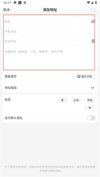 5、填写姓名、手机号、地区及详细地址后保存即可。