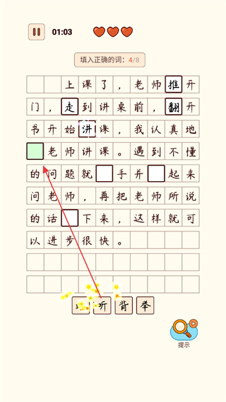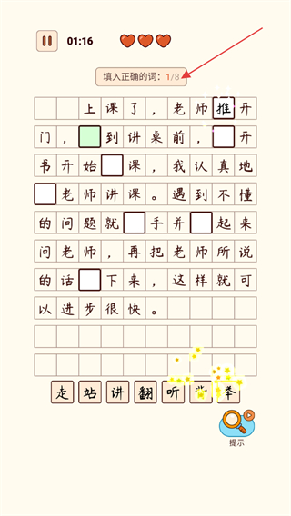 1、在文本空缺处,从下方选字填入,如走,翻等,推进填空进度。