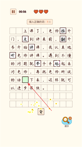 3、选剩余汉字填入空缺,完成所有填空,推进关卡进度。