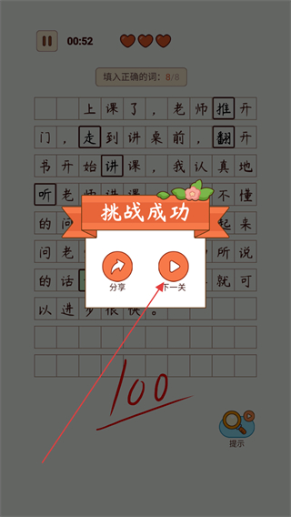 4、完成8处填空后,关卡挑战成功,获得满分,可选择分享或下一关。