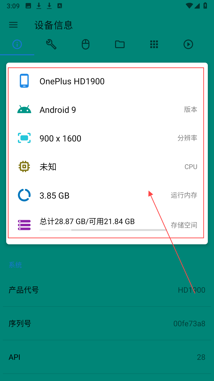 1、打开甲壳虫adb助手进入设备信息页面,可查看手机型号如OnePlus HD1900 ,安卓版本、分辨率、运行内存、存储空间等设备基础信息,了解设备当前状态 。