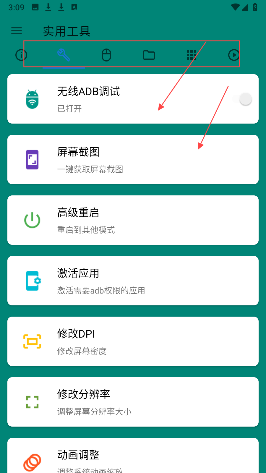 2、进入实用工具界面有无线ADB调试、屏幕截图、高级重启、激活应用、修改DPI、修改分辨率、动画调整等多种功能,根据需求点击相应功能按钮进行操作。
