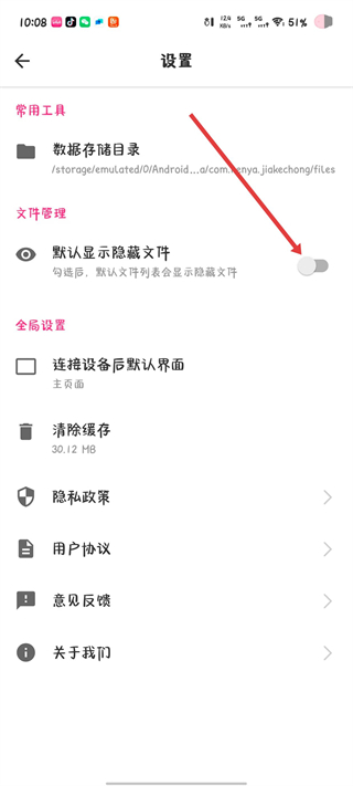 4、在设置界面中找到默认显示隐藏文件对应的开关,点击该开关即可。
