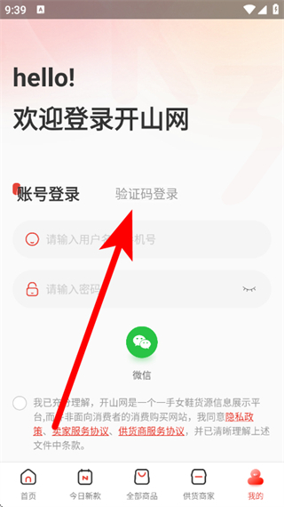 2、在登录界面,点击验证码登录,切换到验证码登录页面。