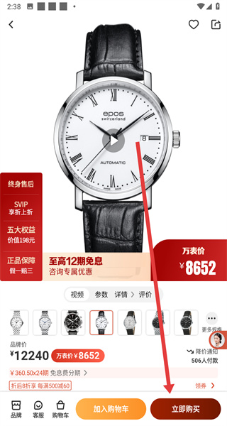 3、在商品详情页面中,可以点击下方立即购买按钮进行挑选手表款式。