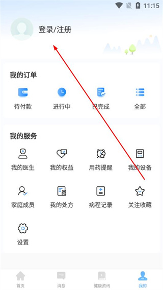 2、进入我的页面,点击登录/注册选项。