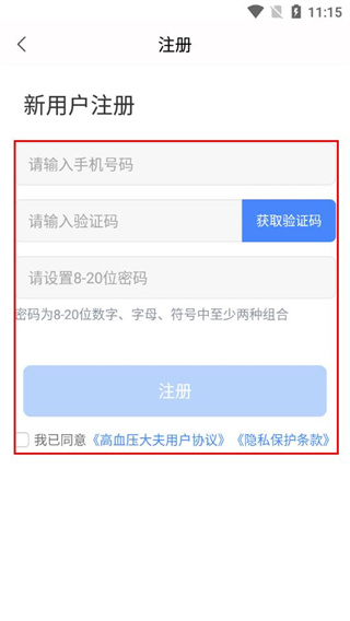 4、在注册页面填写手机号、验证码、设置密码,勾选协议后点击注册。