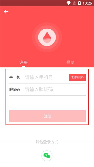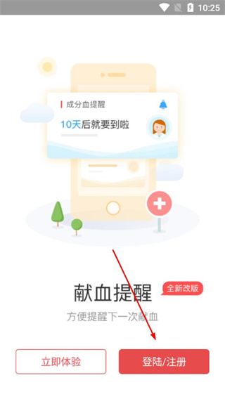 1、在今日献血的献血提醒页面,点击登陆/注册。