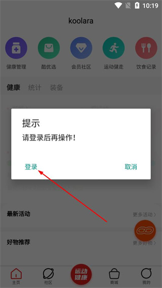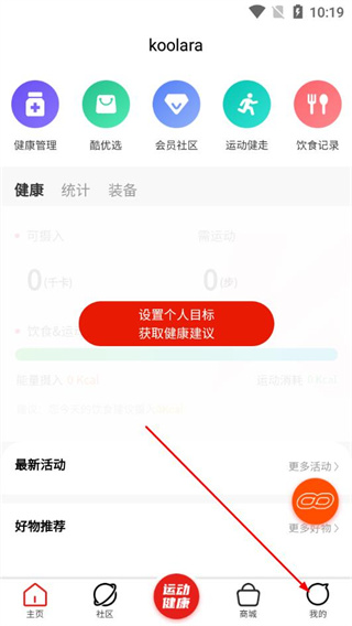 1、在爱动圈的运动健康页面,点击底部的我的选项。