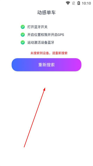 3、在动感单车页面,确认蓝牙、位置权限已开启后点击重新搜索连接设备。