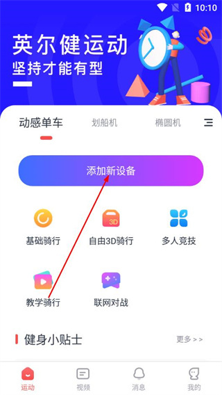 1、在英尔健运动的运动页面,点击添加新设备按钮。