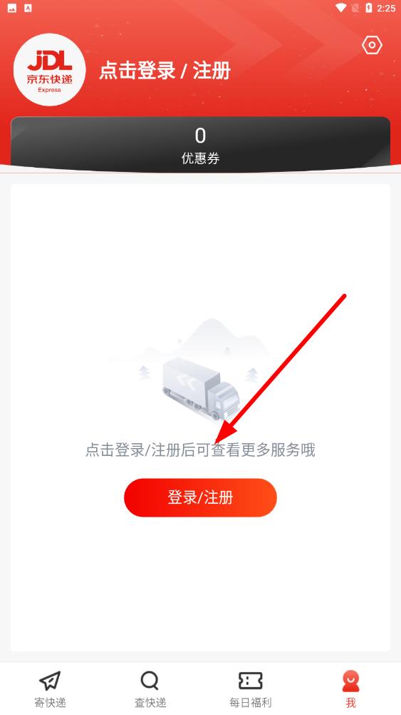 1、在京东快递app主界面,找到登录注册按钮并点击,进入登录注册页面。