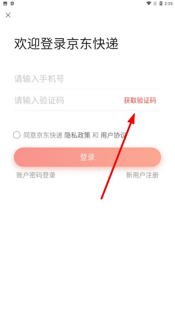 2、在登录页输入手机号后获取验证码,将接收到的验证码填入,勾选同意京东快递隐私政策和用户协议完成登录,即可用查快递寄件等功能。