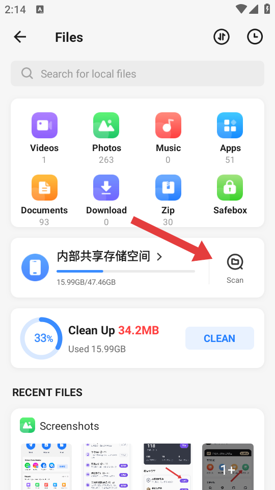 2、在Files页面中,点击内部共享存储空间右侧的Scan按钮,扫描本地文件。