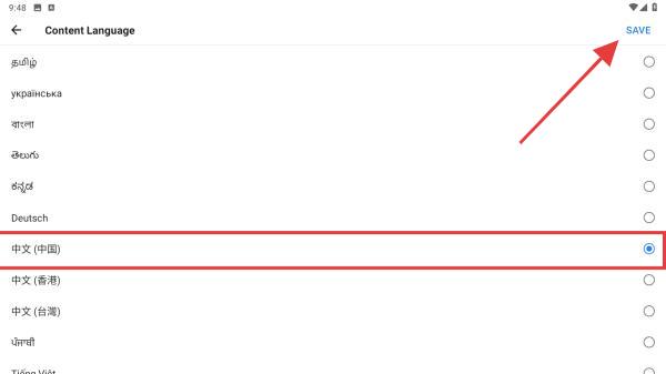 4、进入到语言选择的页面内,向下滑动找到并点击中文,再点击右上角SAVE的按钮即可设置成功。