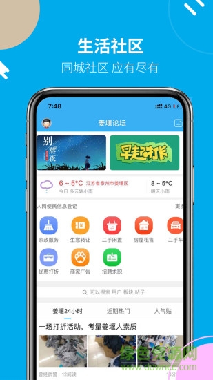 姜堰人网app是一款同城论坛软件,主要针对姜堰用户打造,集合相亲、照片、房产、汽车、娱乐、购物、丽人等信息为一体,在这里你可以快速获取城市动态,线上交流便捷,欢迎来绿色资源网下载!