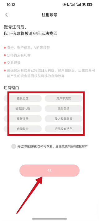 5、在注销账号页面选择对应的注销理由,勾选我已知晓选项,等待倒计时结束后完成账号注销操作。