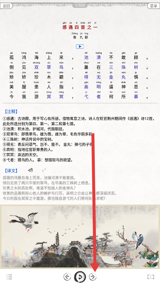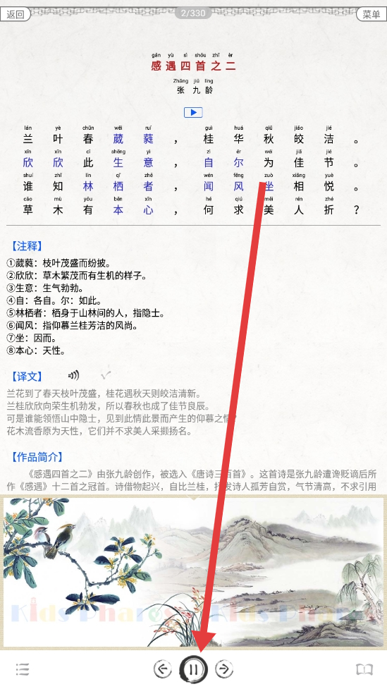3、在第二章唐诗页面,点击底部中间播放按钮,听取诗歌的语言介绍,借助音频加深对诗歌的理解。