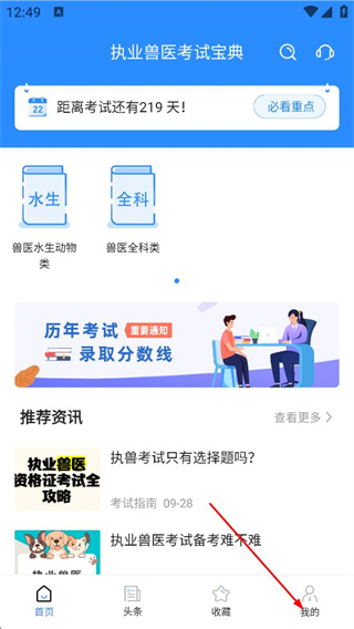 1、在执业兽医考试宝典首页,点击底部我的,进入个人中心页面。
