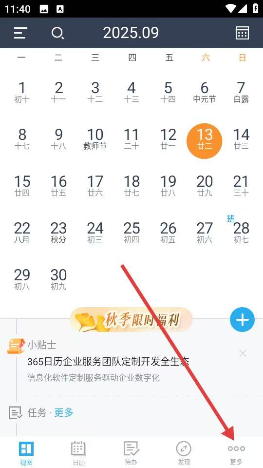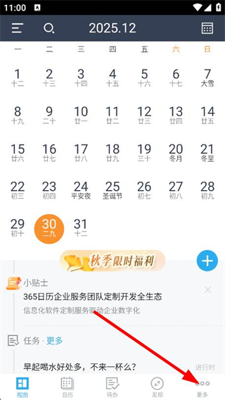 1、打开365日历App,点击页面底部最右侧的更多选项。