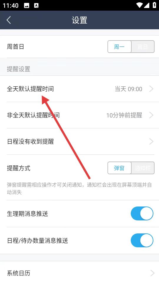 3、进入设置页面后,点击全天默认提醒时间选项。