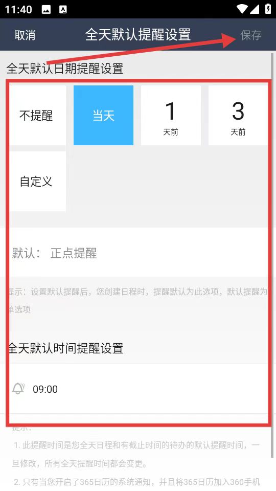 4、选择需要设置的时间,点击保存即可完成设置提醒。