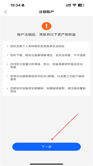 4、进入注销账户的界面内,了解后点击下一步的按钮。