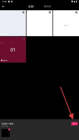 2、在素材选择界面中,选中目标视频素材,点击右下角的导入按钮。