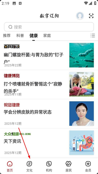 1、在数字辽阳的首页,点击底部的文化选项,进入文化页面。
