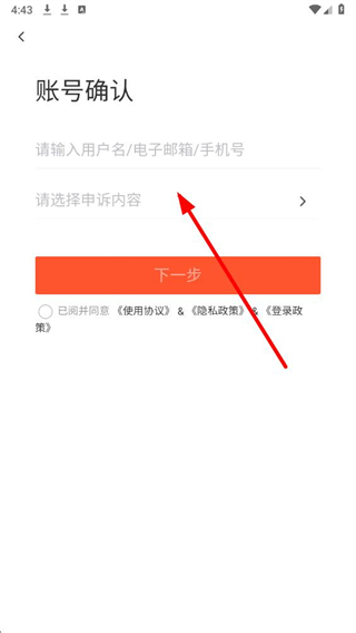 4、在账号确认页面,输入账号信息、选择申诉内容,勾选协议后点击下一步,按提示完成申诉流程以解封账号。