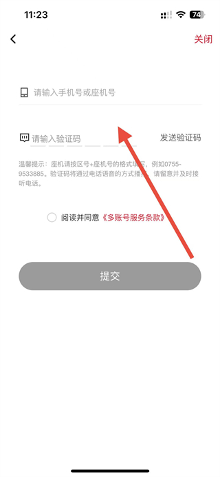 4、在账号填写页面,输入要添加的手机号或座机号,获取并填写验证码,勾选协议后点击提交完成账号添加。