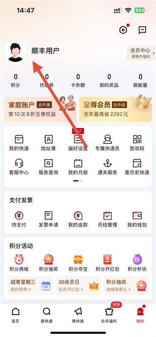 1、在顺丰速运我的页面,点击头像区域,进入登录相关操作界面。