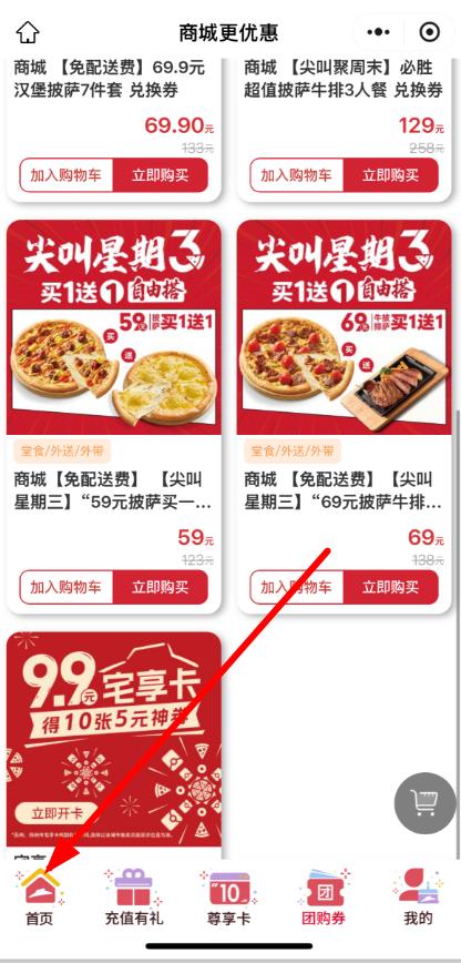 1、首先打开必胜客app,点击底部导航栏中的首页选项进入首页界面。