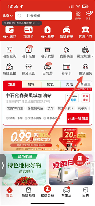 1、在易捷加油主界面,找到并点击更多服务选项,进入全部服务的功能列表页面。