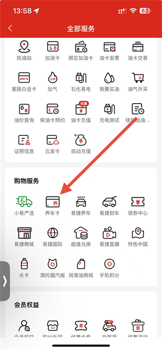 2、在全部服务页面的购物服务区域,找到养车卡选项并点击,进入易捷养车卡的相关界面。