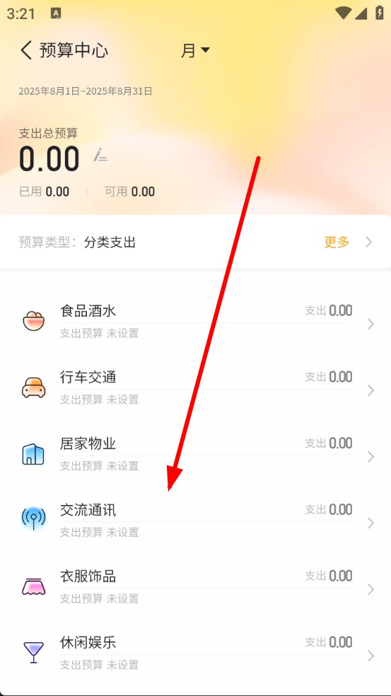3、在预算类型列表中,找到想要设置固定支出的项。