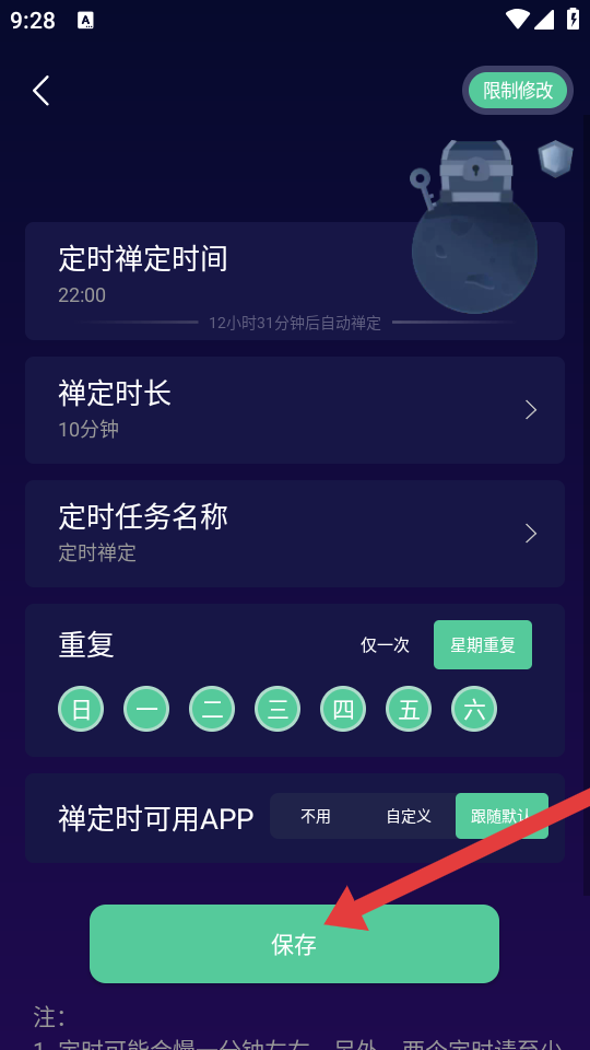 3、设置好定时禅定时间等内容后,点击保存按钮,确认本次定时设置。