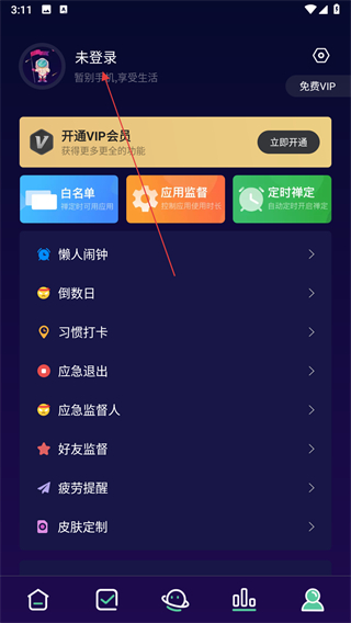 1、打开禅定空间应用,进入主页面,找到左上角的未登录区域,点击进入登录选择页面。