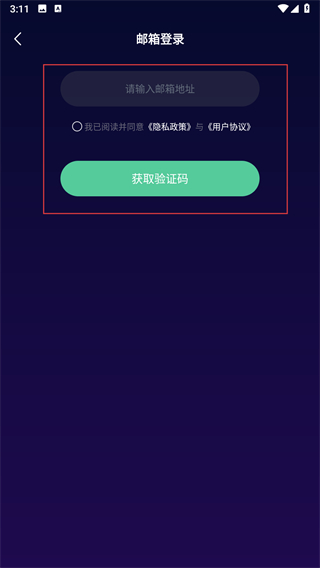 3、在邮箱登录界面,先输入对应的邮箱地址,勾选相关协议后点击获取验证码按钮。