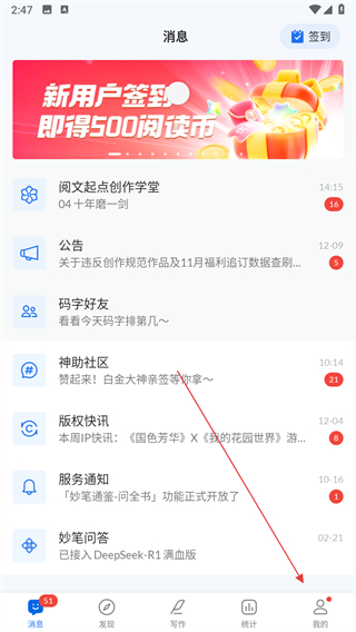 1、打开作家助手应用,进入消息页面,找到底部导航栏的我的选项,点击进入。