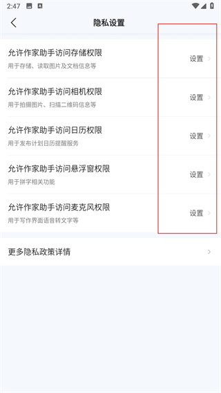 4、在隐私设置界面,选择对应权限右侧的设置按钮,按提示调整权限状态完成管理。