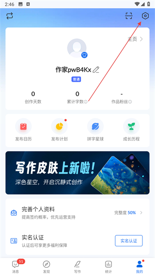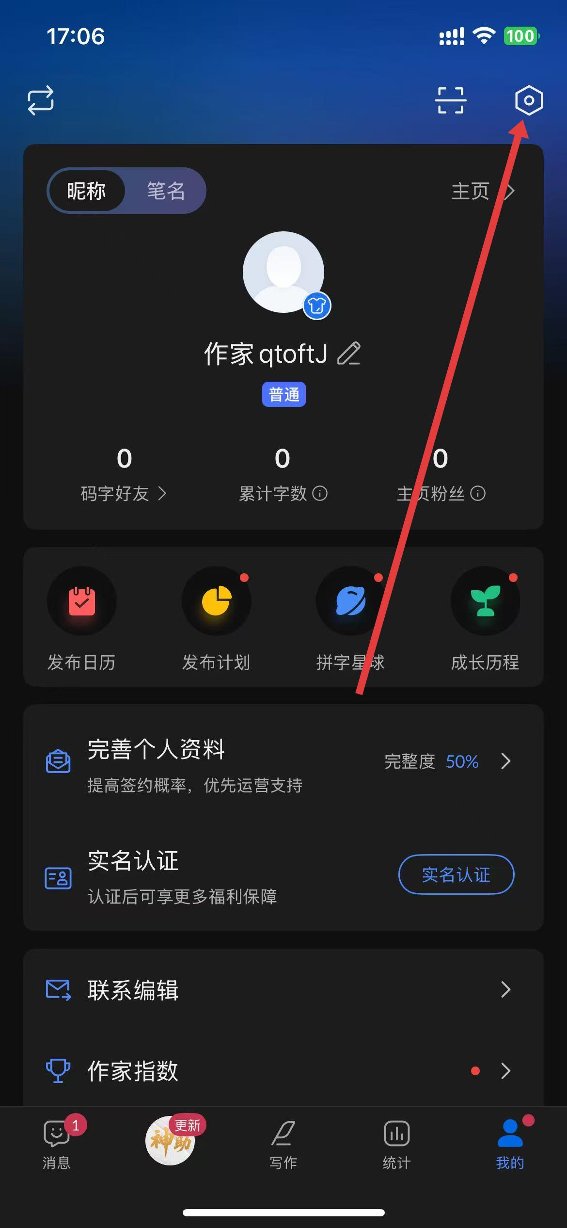 1、打开作家助手APP,进入个人页面后点击右上角设置图标。